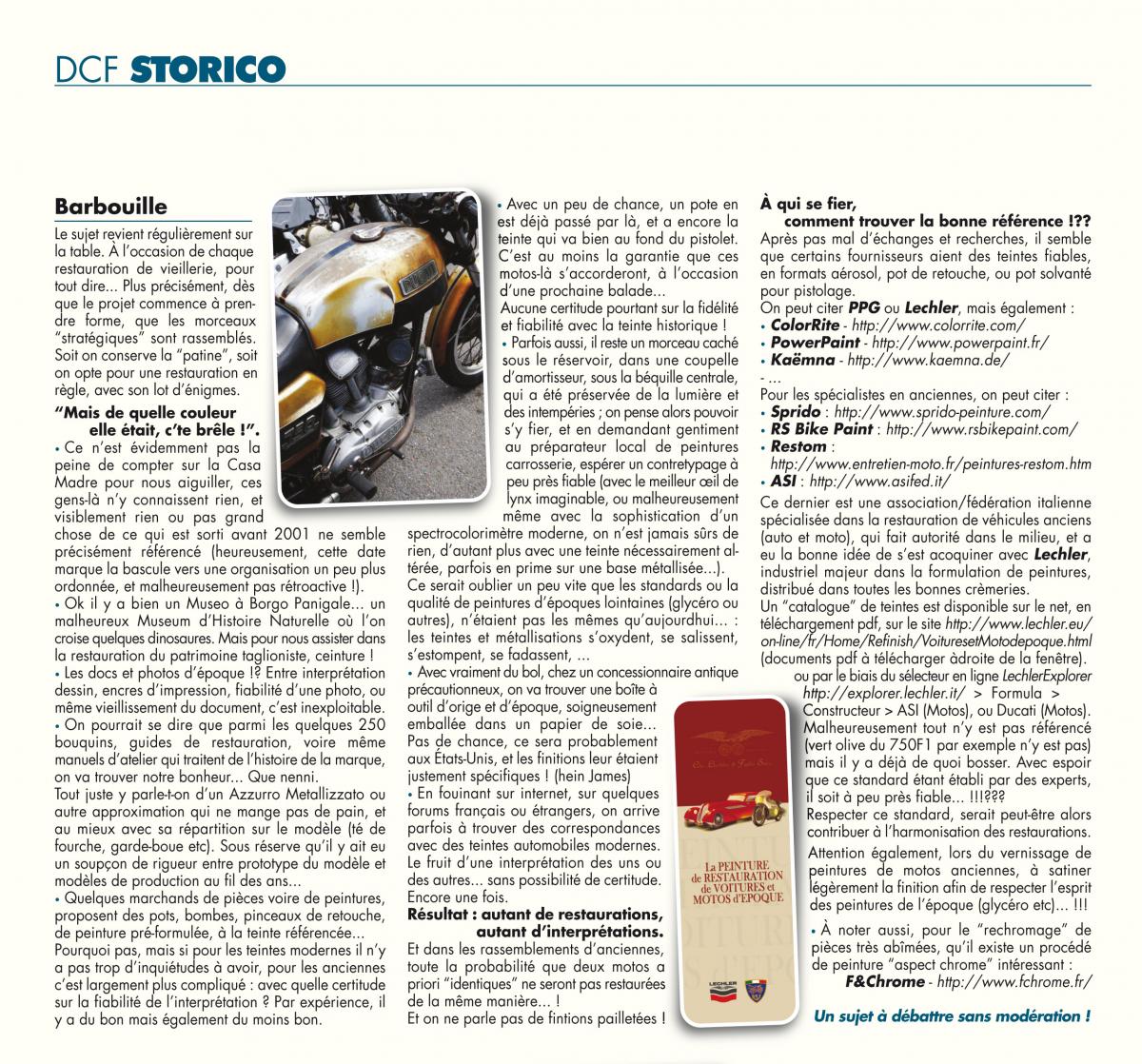 • Un référenciel liste les coloris de différentes marques, dont les Ducati. Ces teintes sont disponibles chez les préparateurs de teintes aurtomobiles Lechler, avec les références exposées dans ce document...